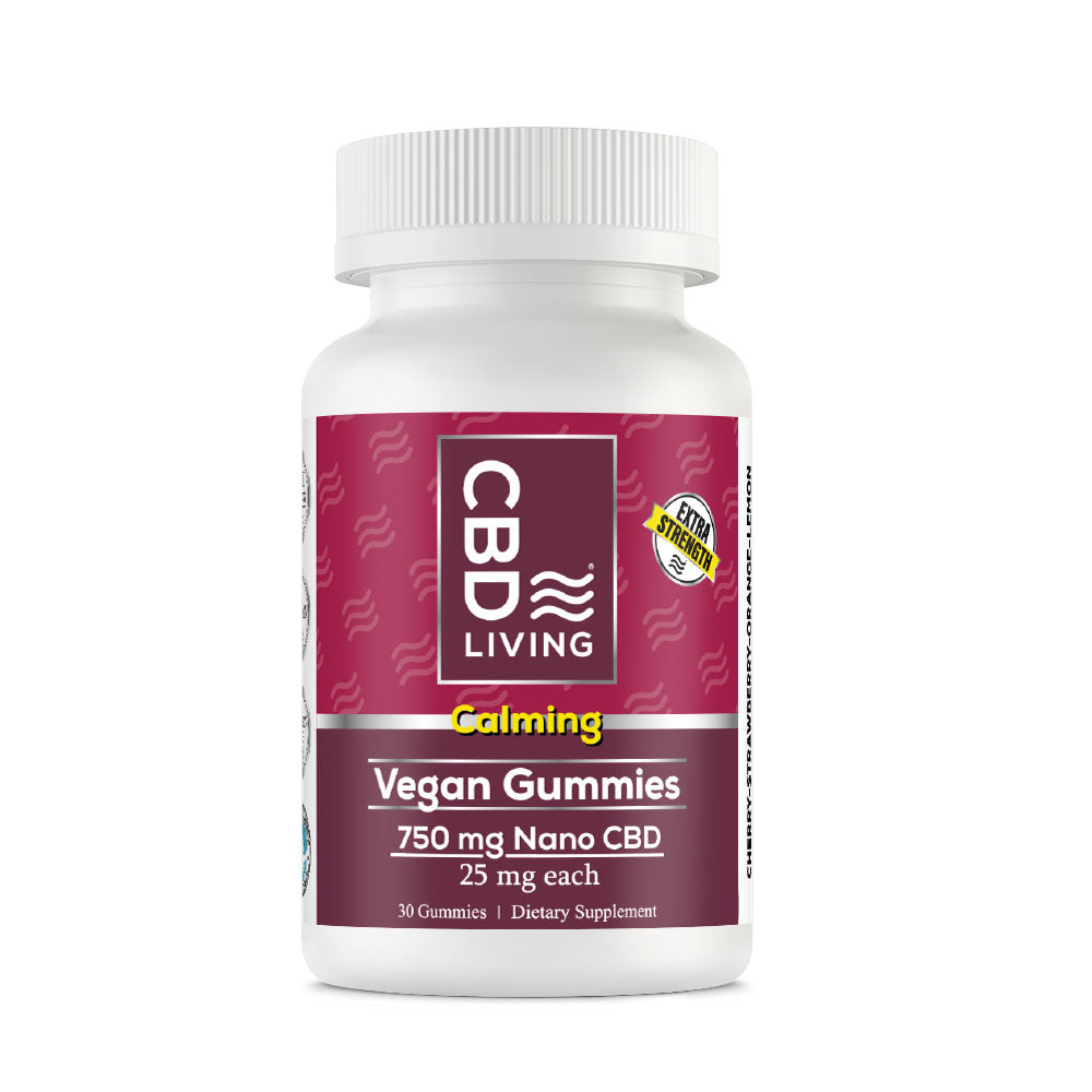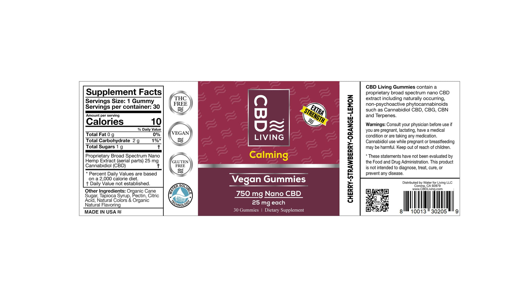 - Each CBD Living Extra-Strength Vegan Gummy contains 25 mg of nano-CBD, 10 calories and 1 gram of sugar.