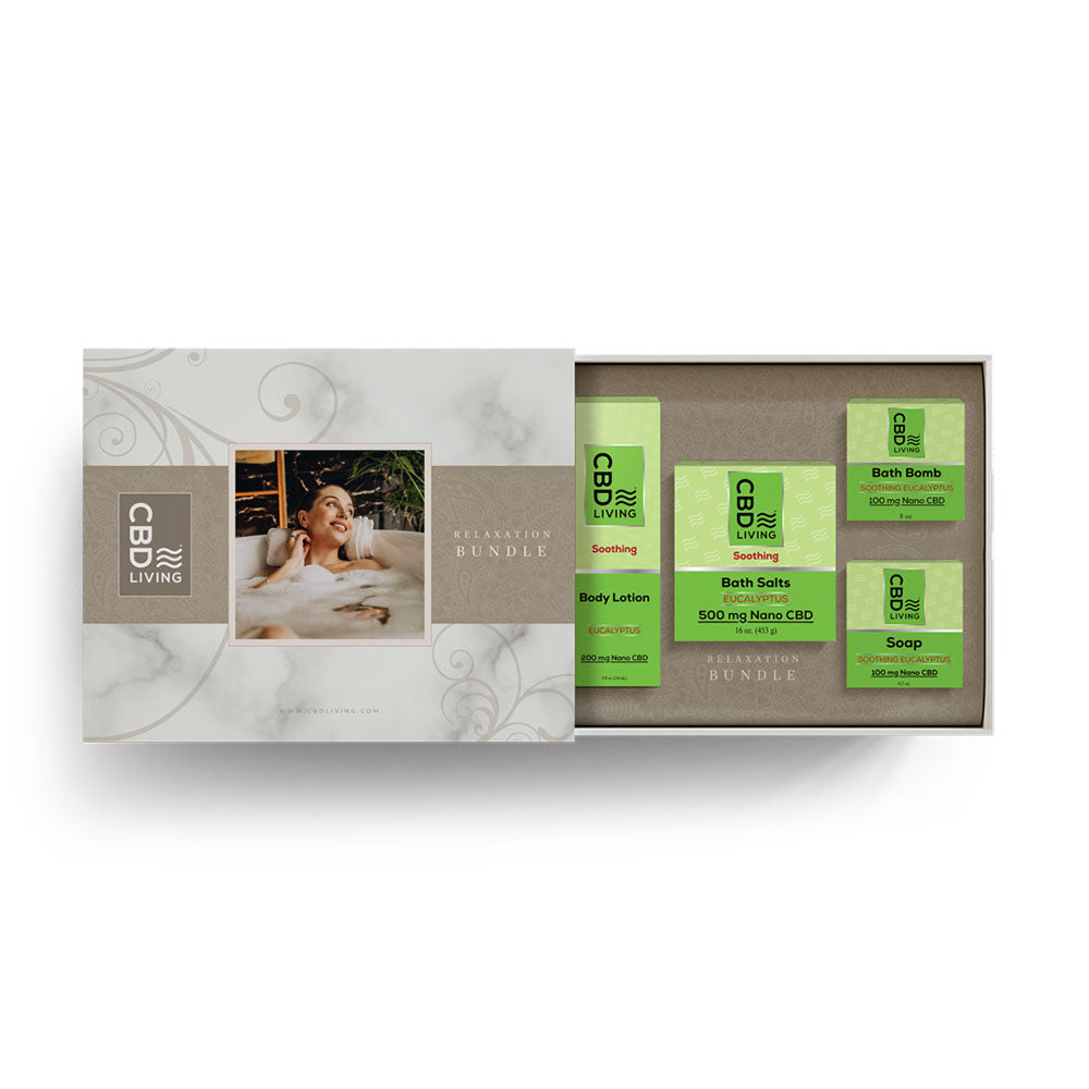 The CBD Living Relaxing Eucalyptus Spa Kit contains some of our best-smelling bath products to soothe and moisturize skin, including: