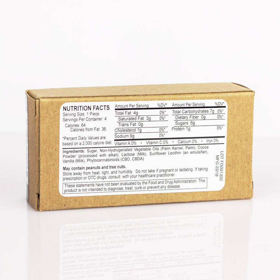 Ingredients (Dark Mint Chocolate): Sugar, Non-Hydrogenated Vegetable Oils (Palm Kernel, Palm), Cocoa Powder (processed with alkali), Lactose (Milk), Sunflower Lecithin (an emulsifier), Vanilla (Milk), Phytocannabinoids (CBD, CBDA), Caprylic/Capric Triglycerides, Natural Flavors