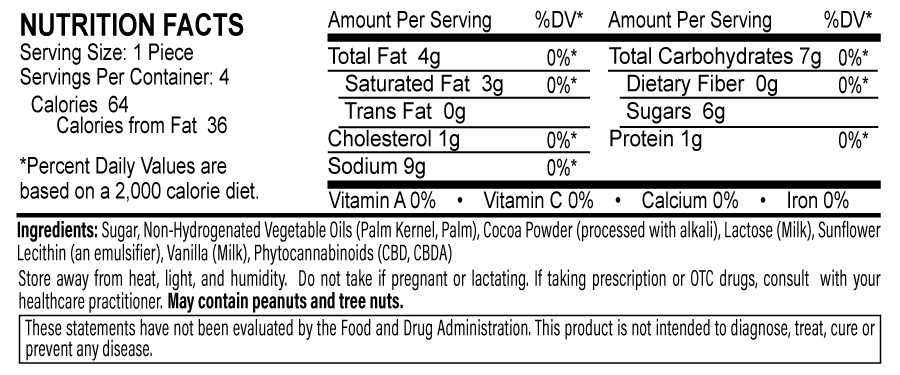 Ingredients: Sugar, Non-Hydrogenated Vegetable Oils (Palm Kernel, Palm), Cocoa Powder (processed with alkali), Lactose (Milk), Sunflower Lecithin (an emulsifier), Vanilla (Milk), Phytocannabinoids (CBD, CBDA)